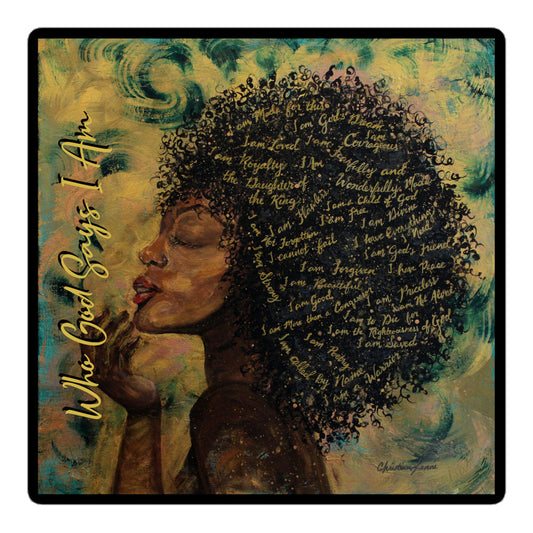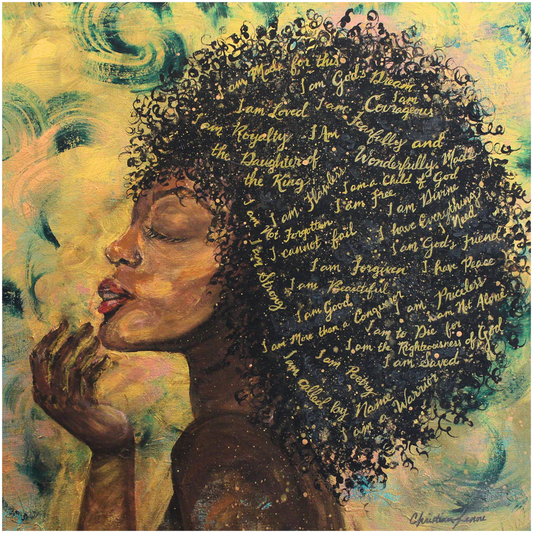 The "Who God Says I Am" collection starts with a painting that delves into the depths of identity and affirmation. With its intricate brushwork and vibrant colors, it brings to life the profound truth found within